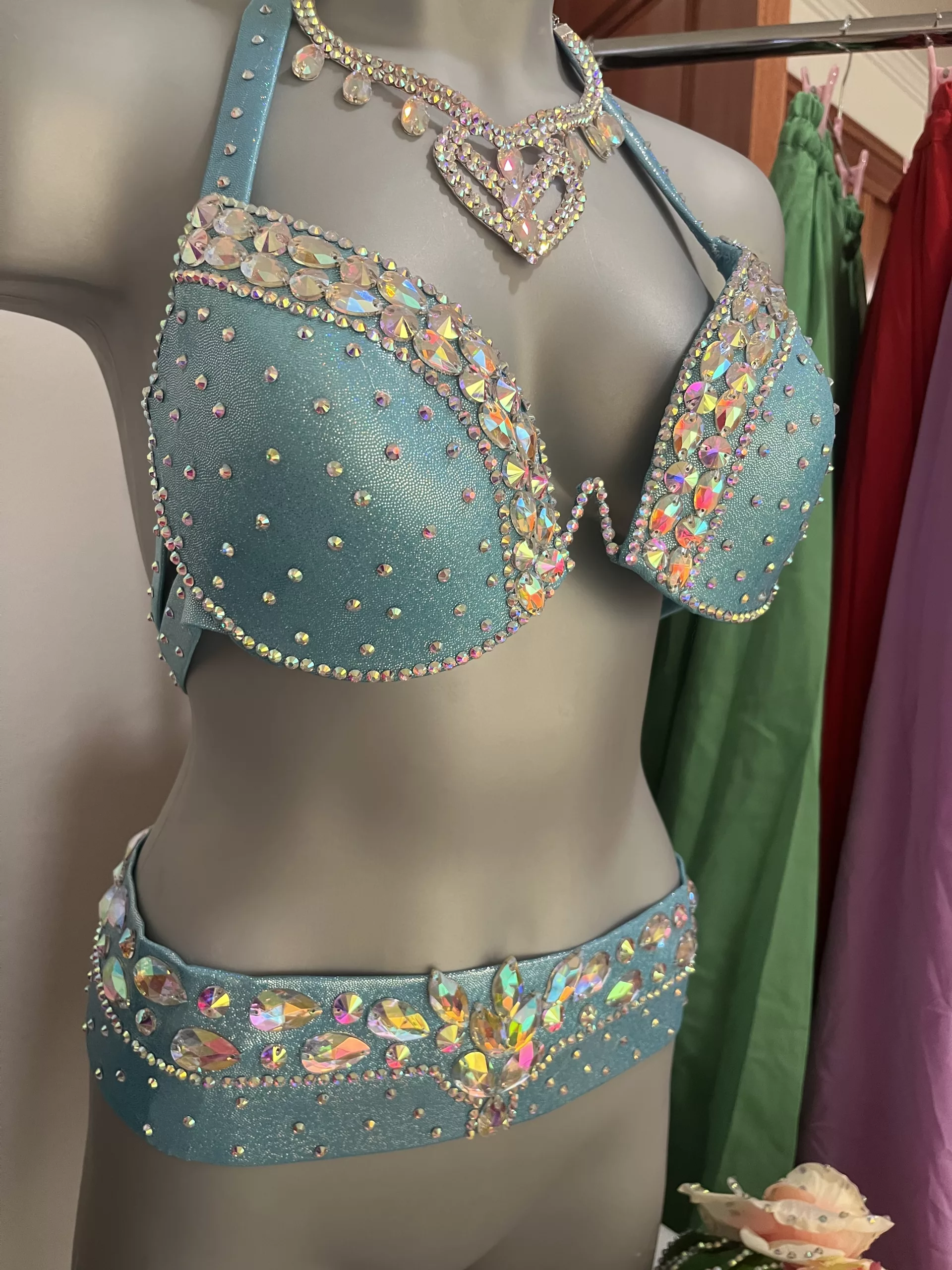 Sujetador y fajín realizados completamente a mano, con cristales de alta calidad de brillo, para que destaques en todas tus puestas en escena.