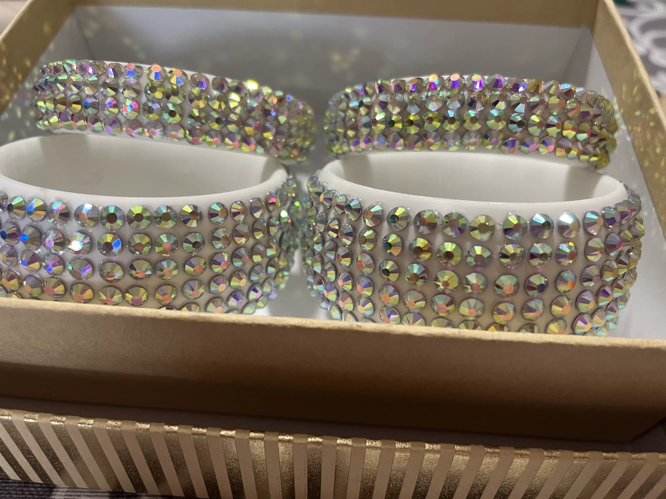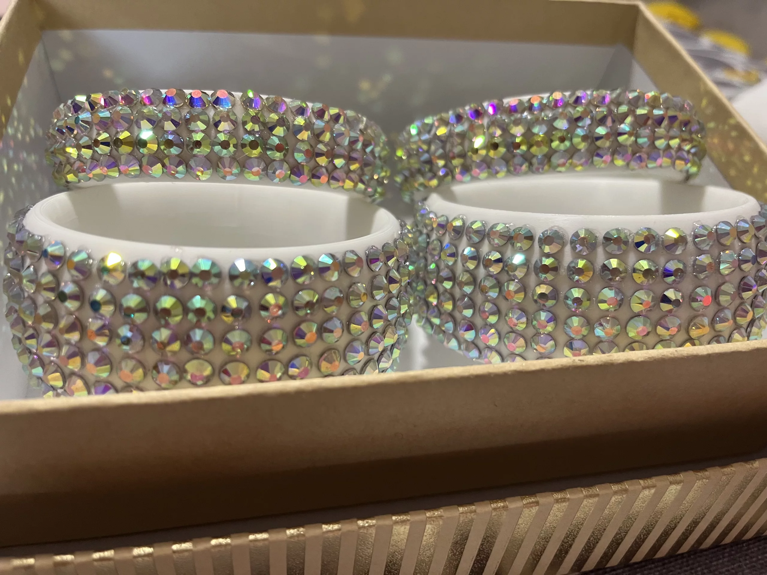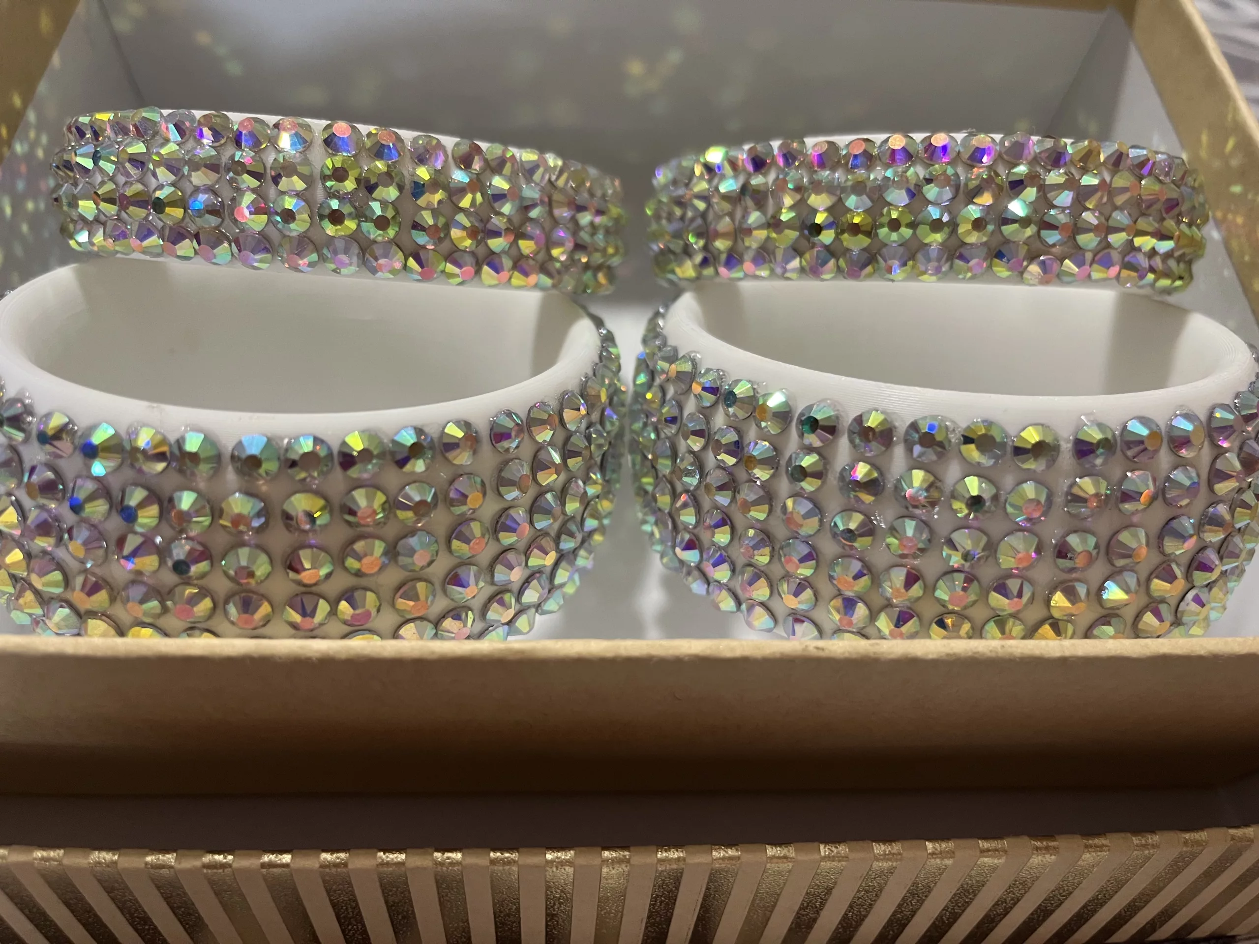 El conjunto incluye 4 pulseras, 2 finas y dos anchas, con cristales estilo swarovski.